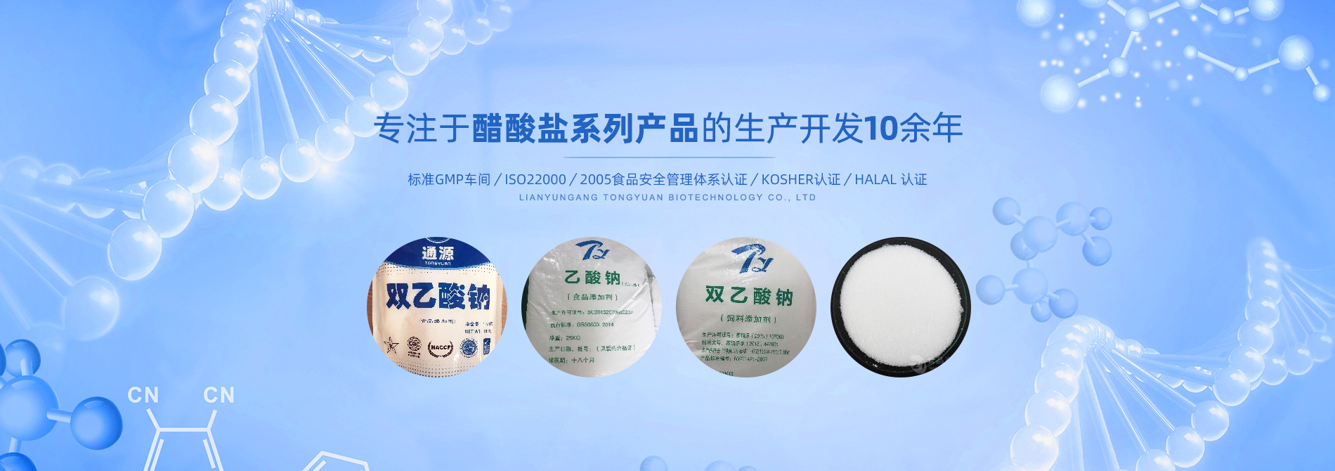 連云港市通源生物科技有限公司 是生產雙乙酸鈉、無水醋酸鈉、三水醋酸鈉、醋酸鉀、乙酸鈉、丙酸鈉、丙酸鈣和氯化鉀等系類醋酸鹽產品的專業制造商。公司專注于醋酸鹽系列產品的生產開發10余年,是國內專業醋酸酸鹽產品生產基地?! ∧壳?,我們已和全球30多個國家和地區建立長期的業務合作關系,是中國較大的雙乙酸鈉生產商和出口商之一。作為中國食品添加劑和配料協會理事單位,通源公司已建成標準GMP車間5000余平方米,通過了ISO22000:2005食品安全管理體系認證、KOSHER認證、HALAL 認證等,這些都是我們提供高質量產品和優良服務的前提和確保。 生產出色產品,提供優良服務,滿足顧客需要,是我們努力的目標。愿和我們的朋友們攜手,共...